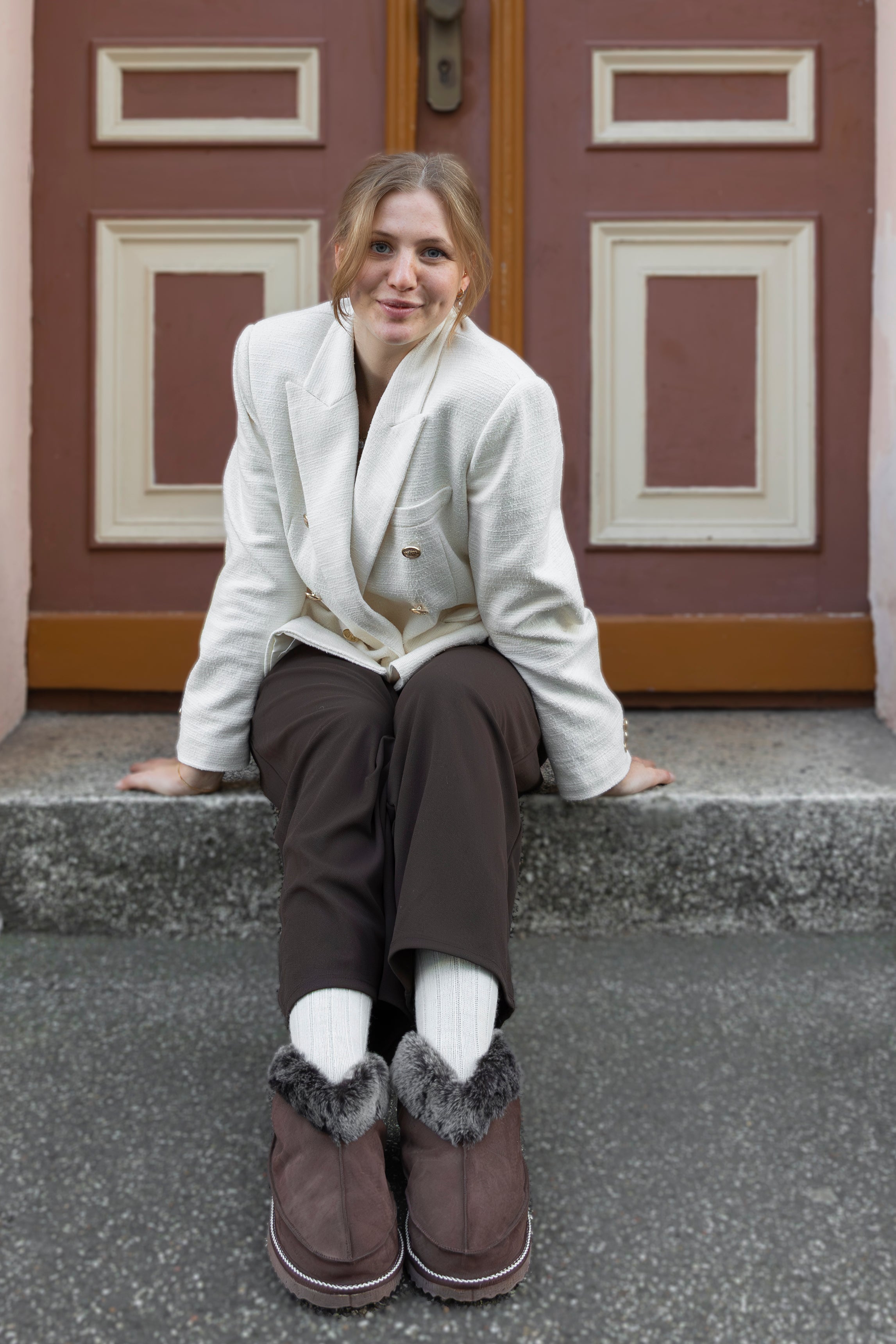 Person wearing brown suede shoes with white fuzzy lining, sitting on a stone surface.